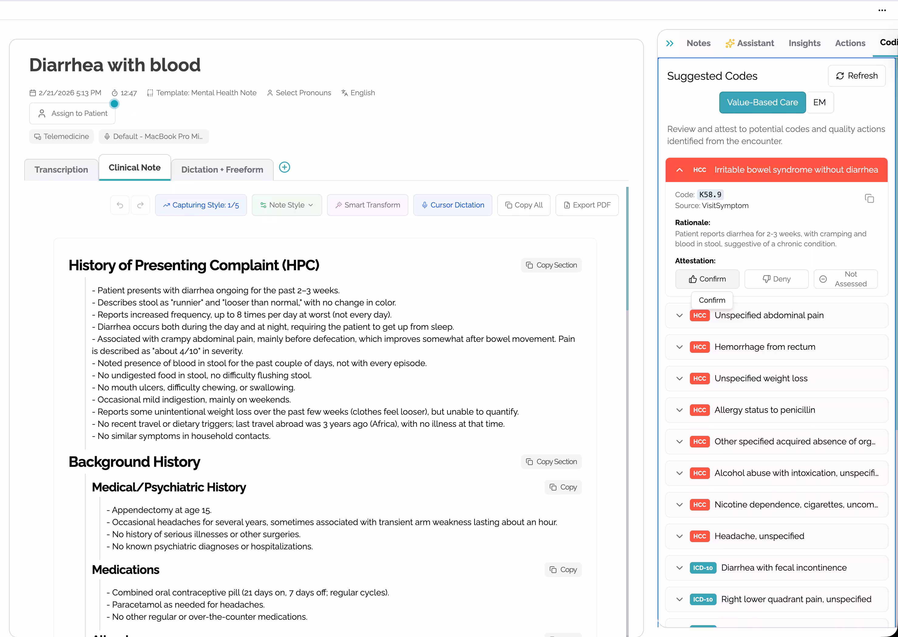 - ICD-10 and CPT billing code suggestions